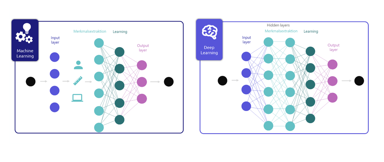 Der große Unterschied zu klassischen ML-Ansätzen: Deep-Learning-Modelle können relevante Merkmale automatisch aus den Daten ableiten, während traditionelle Modelle diese Merkmale noch manuell benötigen.